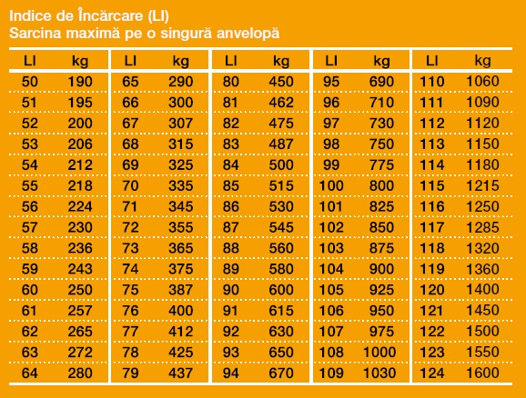 5. Indicele de sarcina (capacitatea maxima de incarcare) indica greutatea maxima pe care o poate sustine o anvelopa la presiunea optima de umflare. Producatorii auto calculeaza acest indice raportandu-se la greutatea autovehiculului + incarcatura maxima admisa. Se recomanda sa fie respectata valoarea acestui indice pentru ca se reduce riscul de explozie la rularea cu masina incarcata. Indicele de sarcina se masoara in livre si kilograme si este mentionat in doua locuri pe flancul anvelopei.